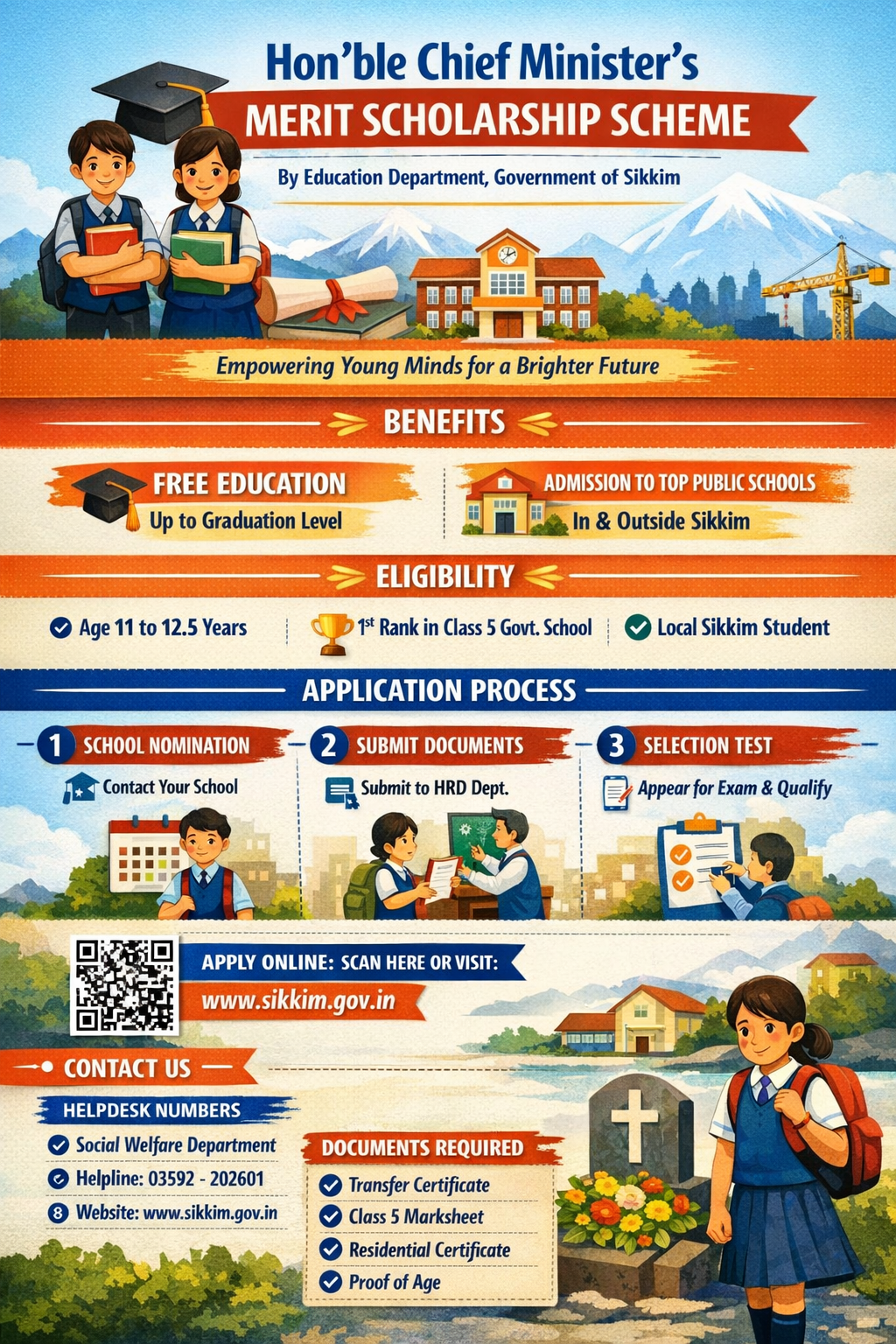 The scheme “Hon’ble Chief Minister’s Merit Scholarship Scheme” was launched by the Education Department, Government of Sikkim in the year 2010. This scheme aims to provide free education up to the Graduation level to talented and deserving children from underprivileged family with an opportunity to study in reputed Public Schools both within and outside the State. The selected students will be admitted to the Public Schools empanelled with HRD Department within and outside the State.