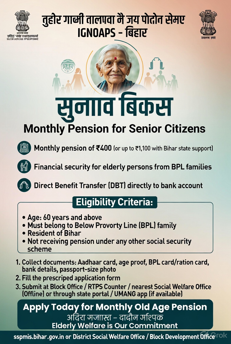 The scheme “Indira Gandhi National Old Age Pension Scheme” is implemented by the Social Welfare Department, Government of Bihar. Under this scheme, a monthly pension is provided to elderly people (women/men) aged 60 years or above belonging to Below Poverty Line (BPL) families to support them financially. This scheme is centrally sponsored.