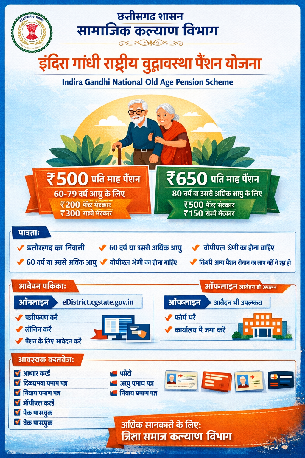 The scheme “Indira Gandhi National Old Age Pension Scheme” is implemented by the Social Welfare Department, Government of Chhattisgarh. Under this scheme, financial assistance is provided to elderly people aged 60 years and above living Below the Poverty Line (BPL) to support them in living a respectful life. This scheme is centrally sponsored.