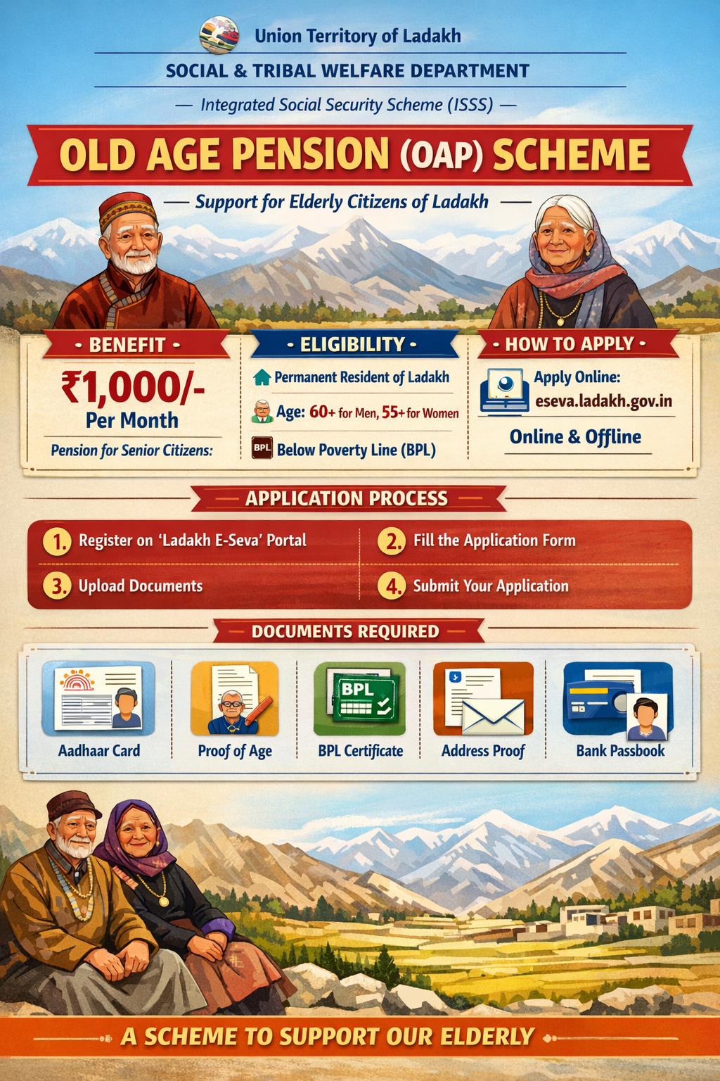 The scheme “Old Age Pension (OAP)” is a sub-component of the “Integrated Social Security Scheme (IGSSS)” implemented by the Social and Tribal Welfare Department, Administration of Union Territory of Ladakh. Under this scheme, pension is provided to old aged persons males (60 years & above) and females (55 and above) and who are destitute in the sense of having no means of subsistence from their own source of income or through financial support from family members or other sources.