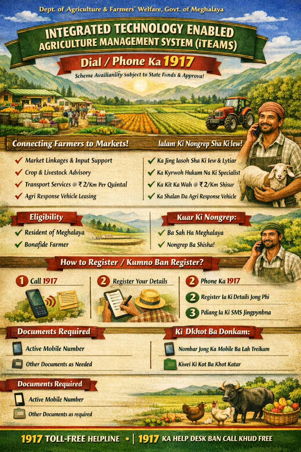 The scheme “Integrated Technology Enabled Agriculture Management System Or iTEAMS” was launched by the Department of Agriculture & Farmers’ Welfare, Government of Meghalaya to address the critical issues of enabling and facilitating access to remunerative and sustainable markets for farmers’ produce in the most transparent and effective manner through facilitation service iTEAM Dial 1917, whereby farmers can be assisted on the following activities