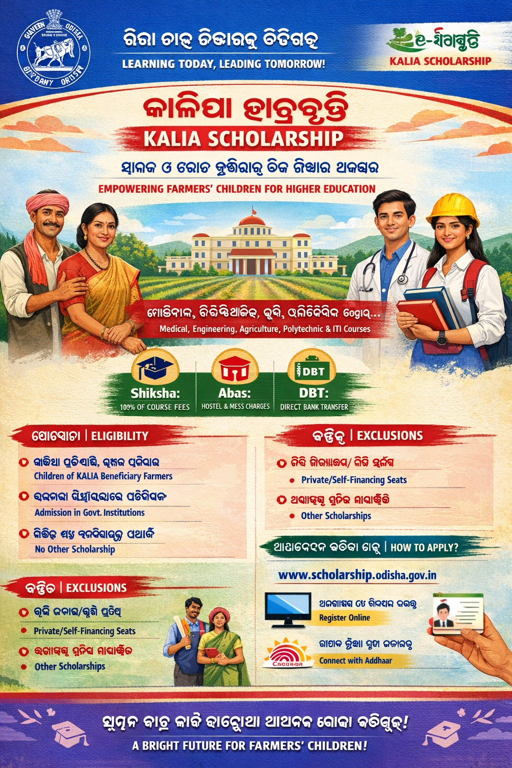 The objective of the scheme is to extend financial assistance to the children of the beneficiaries under KALIA for pursuing Professional/Technical courses in the State of Odisha. It will lead to better access to Higher Education for children of Small and marginal farmers (SF/MF), Actual cultivators (sharecroppers), and Landless Agricultural households (LAH). KALIA Scholarship will support SF/MF & LAH in empowering their families.