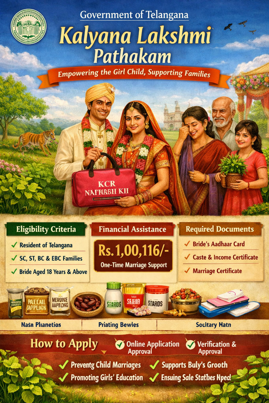 The scheme “Kalyana Lakshmi Pathakam” was launched in 2014 by the Backward Classes Welfare Department, Government of Telangana, aims to alleviate financial distress in SC/ST and minority families by providing financial assistance to unmarried girls at the time of marriage. this scheme, a one-time financial assistance of ₹1,00,116 (₹1,25,145 for disabled girls) is provided to eligible girls at the time of marriage.