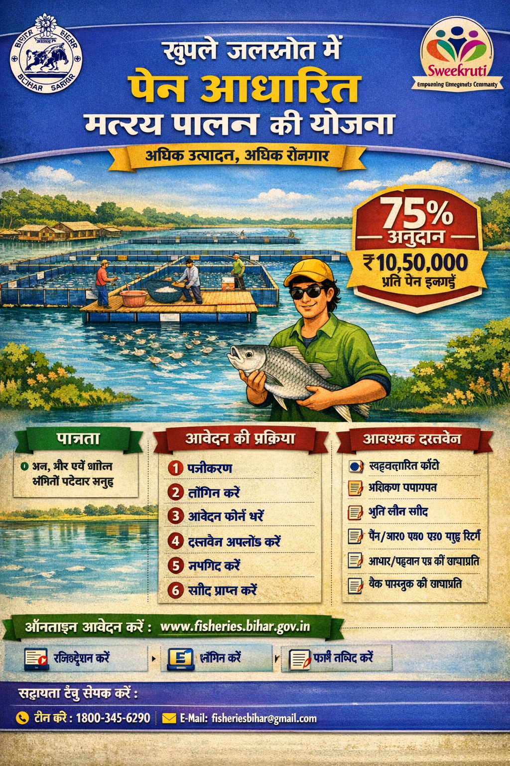 The “Khule Jalsroto Mei Pen Aadharit Matsya Paalan ki Yojana” was launched by the Animal and Fisheries Resources Department, Government of Bihar. The scheme aims to increase fish productivity and production through semi-intensive/intensive fisheries of large-scale available government wetland water sources (Man, Chaur, and Lake, etc.), and strengthen aquaculture through species diversification. It seeks to increase the income of farmers/fishermen and provide new employment opportunities.