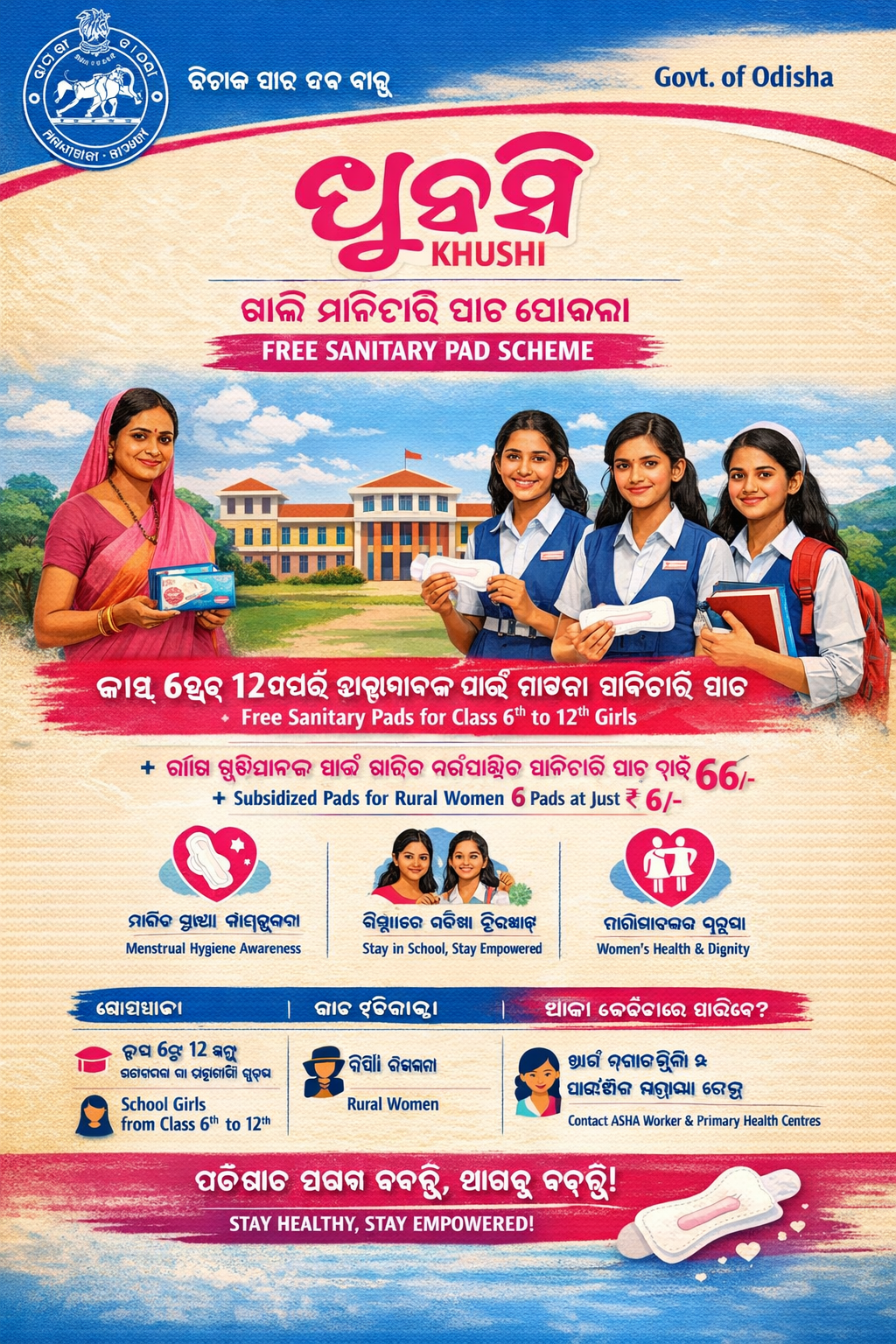 The Department of Health and Family Welfare, Government of Odisha had introduced a scheme named “Khushi” which aims to provide Free sanitary napkins to all girls in Government and aided schools from class 6th to 12th. Khushi (meaning “Happiness” in Odia) is a female health and hygiene program run by the Government of Odisha to provide free sanitary pads to girl students in Odisha. Khushi scheme of Odisha aims to provide good menstrual hygiene care to women of the state. The initiative aims to promote health and hygiene among school-going adolescent girls leading to higher retention in school and greater empowerment of women. The scheme provides free sanitary pads to girls in government and government-aided schools and also offers subsidized sanitary napkins to rural women. The scheme’s goals include reducing the dropout rate among girls, improving academic performance, and empowering women. The Odisha State Medical Corporation Limited is the implementing agency of this scheme.