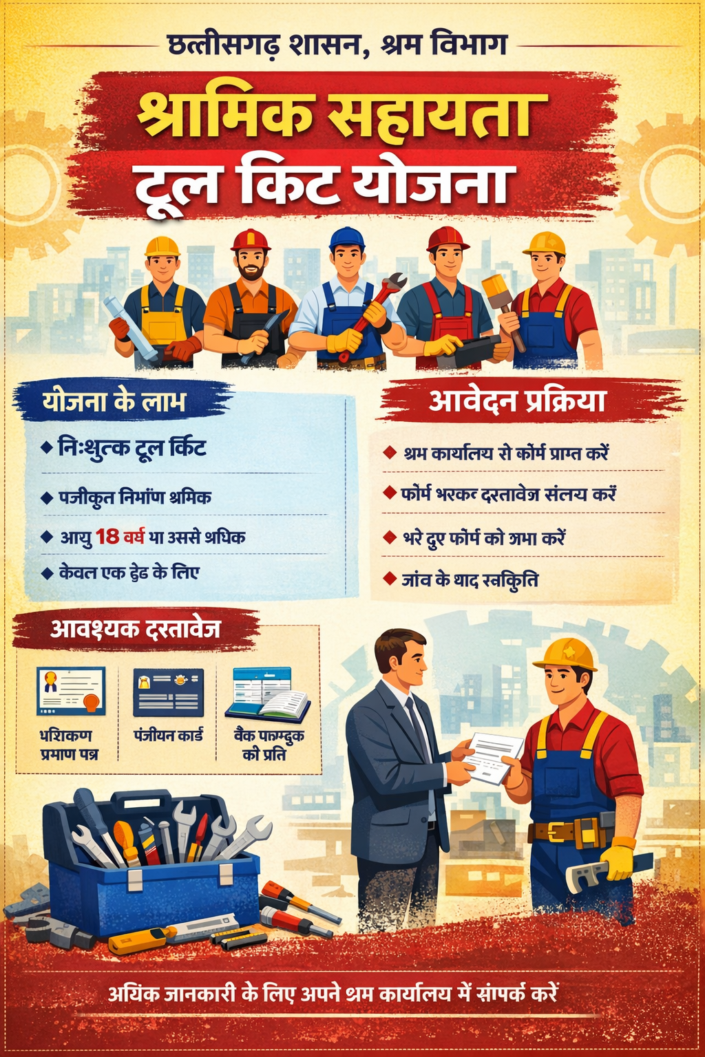 This scheme has been started by the Government of Chhattisgarh and operated by Labor Department. The benefit of the scheme will be given to the beneficiaries of trades like construction work like mason, electrician, plumber, carpenter, porter, painter, etc.