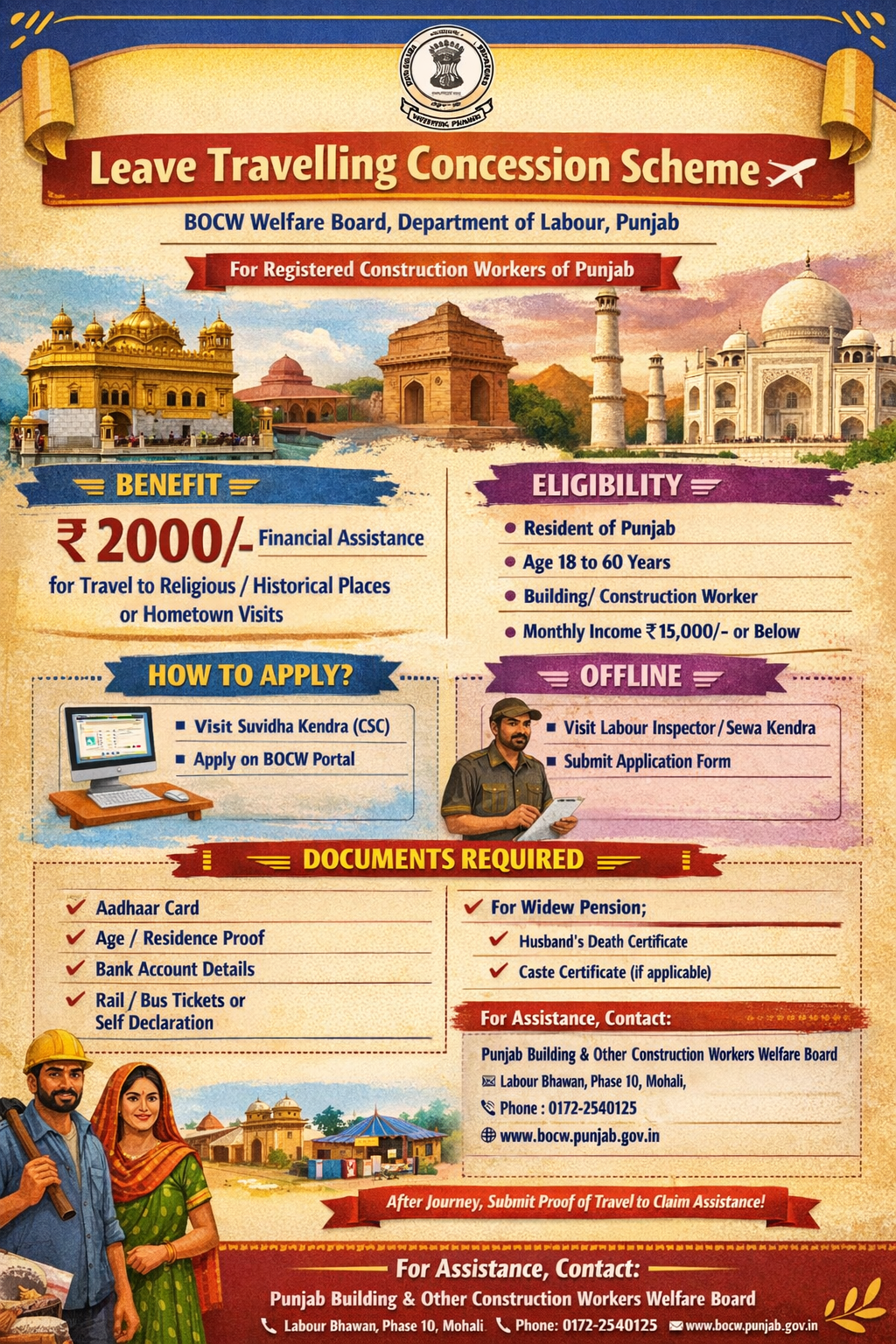 The “Leave Travelling Concession Scheme” by the BOCW Welfare Board, Department of Labour, Punjab, is a welfare scheme for the registered workers of the board. Under this scheme, the Board will provide a certain amount as leave travel concession to the registered construction workers for journeys to religious/ historical places in India or visiting their hometown.