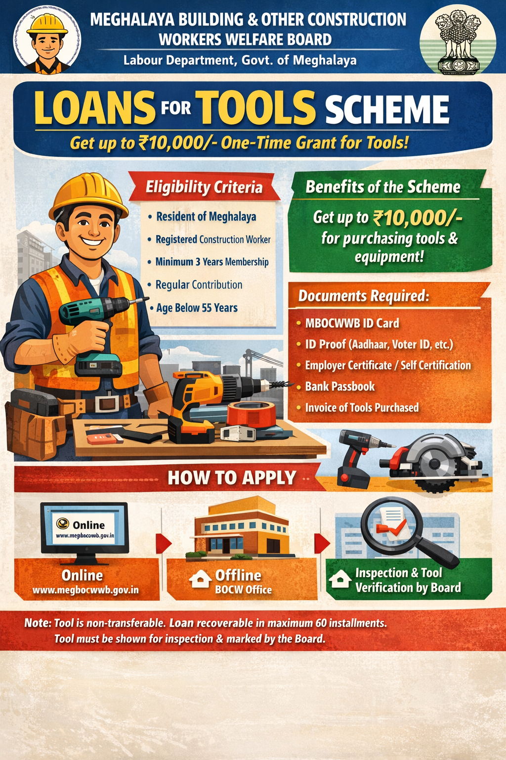 The “Loans for Tools” scheme is implemented by the Meghalaya Building and Other Construction Workers Welfare Board (MBOCWWB), Labour Department, Government of Meghalaya. Under the scheme, a onetime grant will be granted to all members of the fund for the purchase of tools subject to the conditions. The members of the fund who have completed 3 years of membership in the fund and those who remit contributions regularly will be eligible for this loan.