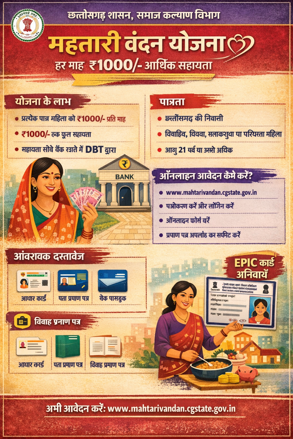 The scheme “Mahatari Vandan Yojana” by the Government of Chhattisgarh aims to provide financial assistance and support to eligible beneficiaries for socio-economic empowerment. The scheme offers monetary benefits and access to essential services, targeting underserved communities. Key eligibility criteria include residency in Chhattisgarh and possession of an EPIC Card. The scheme is implemented by the Department of Social Welfare, and applications are accepted online through the official portal.
