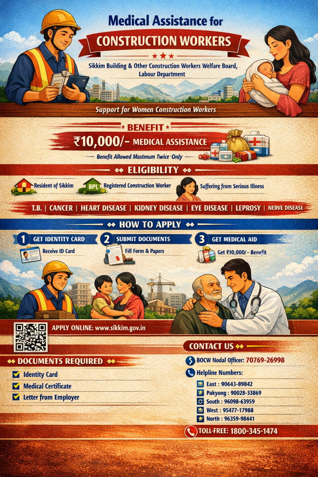 The “Medical Assistance for the Construction Workers” by the Sikkim Building and Other Construction Workers Welfare Board, Labour Department, is a welfare scheme for the registered workers of the board. Under this scheme, medical expenses shall be provided for the treatment of the beneficiary and /or his dependents suffering from T.B. Cancer, Heart Disease, Kidney Disease, Eye Disease, Leprosy and Nerve Disease. However where an operation is involved for the treatment of the diseases like heart Disease, Kidney Disease etc.