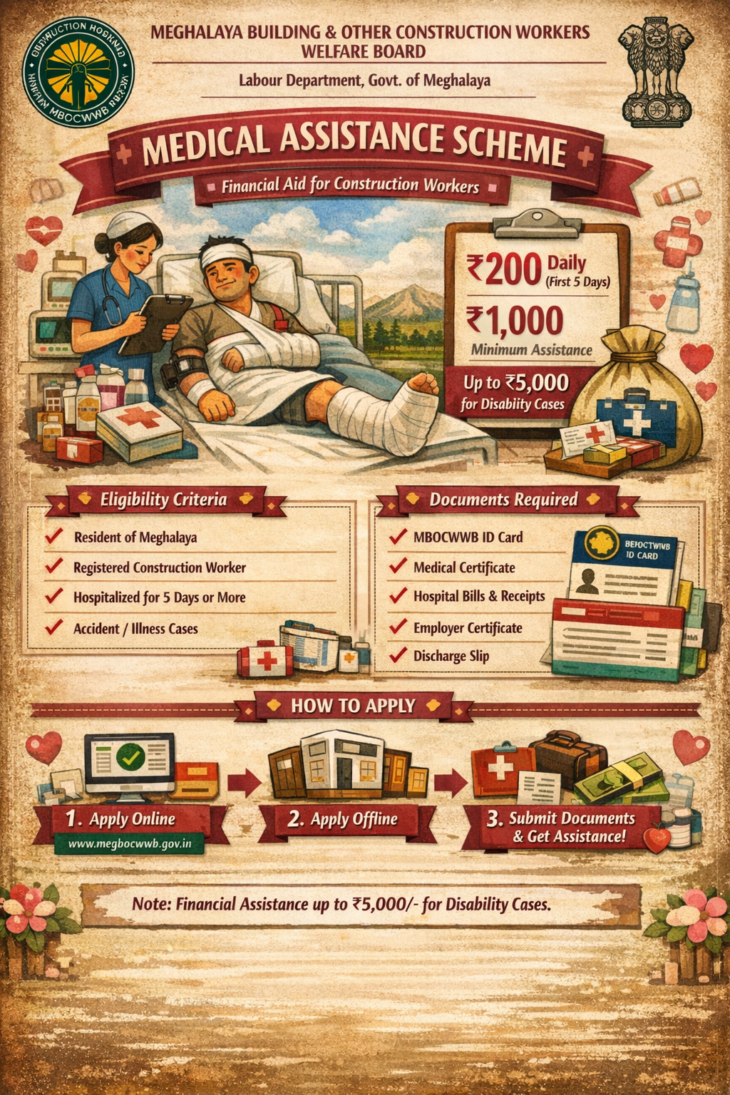 The scheme “Medical Assistance” is a social security scheme, implemented by the Meghalaya Building and Other Construction Workers Welfare Board (MBOCWWB), Labour Department, Government of Meghalaya. Under the scheme, the Board shall provide financial assistance to registered construction workers who are hospitalized for five or more days due to an accident or any disease.