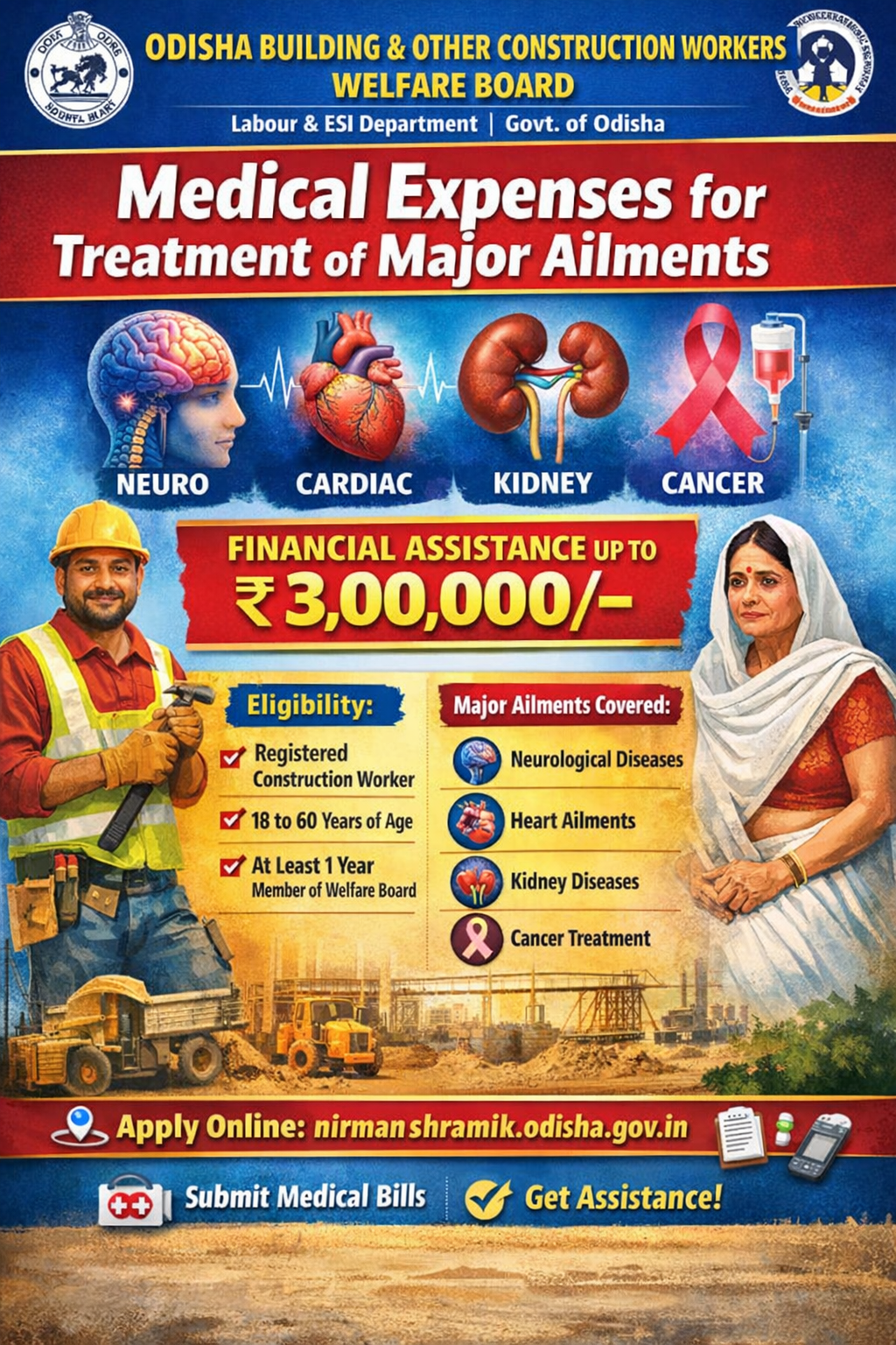 The “Medical Expenses for Treatment of Major Ailments” scheme by the Building and Other Construction Workers Welfare Board, Labour Department, Odisha, is a welfare scheme for the registered workers of the board. Under this scheme, the Board shall provide financial assistance as medical expenses for the treatment of beneficiary or his/ her dependents suffering from disease of Nervous system (Brain & spine related), Cardiovascular System, Kidney and Cancer. The beneficiary should be registered at least for one year in lines of the Odisha State Treatment Fund.