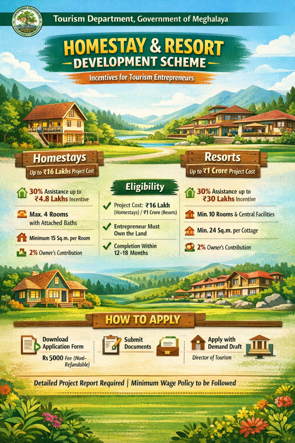 The cost of the project should be within Rs 16.00 Lakhs for homestays and within Rs 100.00 Lakhs for resorts. In case the project cost is above Rs 16.00 Lakhs for homestays and above Rs 100.00 Lakhs for resorts the assistance would be limited to 30% of the amount of Rs 16.00 Lakhs for homestays and 30% of the amount of Rs 100.00 Lakhs for resorts.