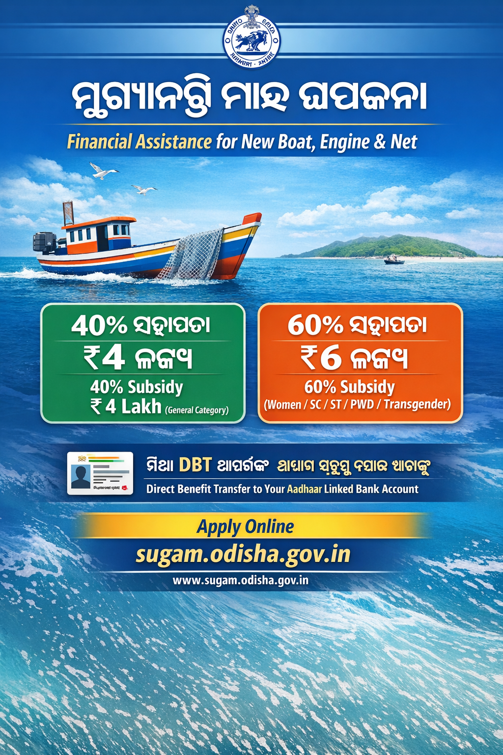 The State plan scheme “MMKY-Financial Assistance for New Boat, Engine, and Net” was launched by the Fisheries & Animal Resources Development Department, Government of Odisha under Mukhyamantri Maschyajibi Kalyan Yojana (MMKY) in order to increase the marine fish production and to enhance incomes and livelihoods of the marine fishers.