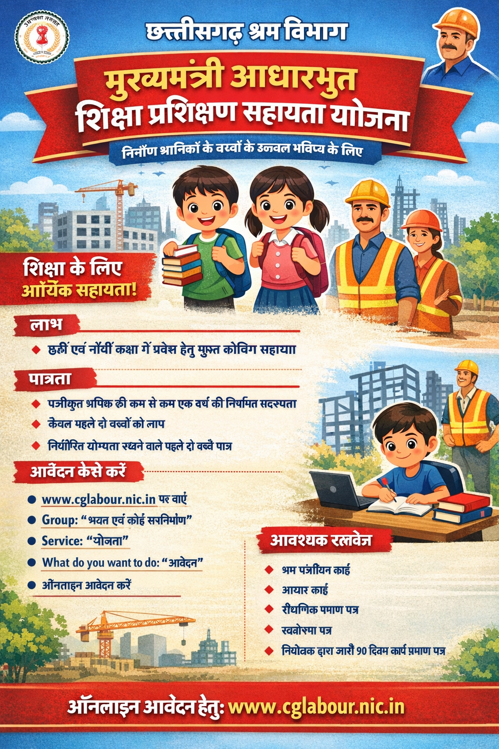 Labor Department of Chhattisgarh State started this scheme “Mukhyamantri Aadharbhut Shiksha Prashikshan Sahayata Yojana” for Building and other construction worker on 29 March 2023.. The main objective of the scheme to provides financial assistance for education.