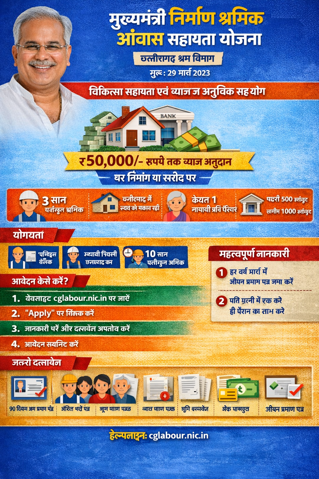 Labor Department of Chhattisgarh State started this scheme “Mukhyamantri Nirman Shramik Awas Sahayata Yojana” for Building and other construction worker on 01 March 2023.. The main objective of this scheme is to provide financial assistance for constructing a house on their own plot or purchasing a new house for their better living.