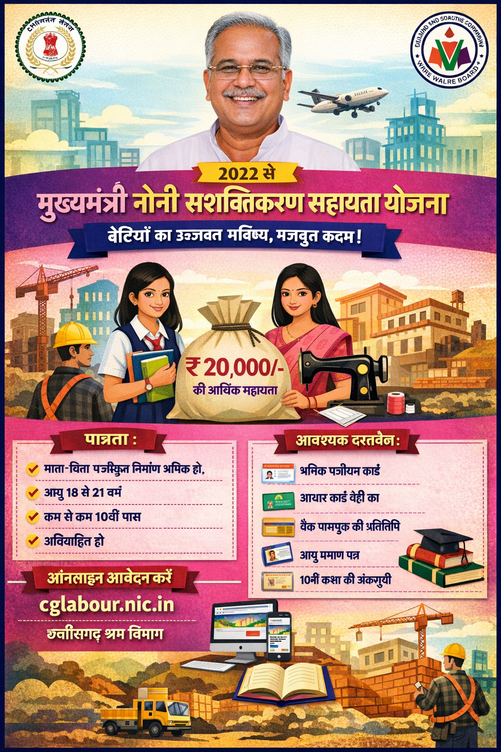 In 2022, Chhattisgarh State Government started the “Mukhyamantri Noni Sashaktikaran Sahayata Yojana” for the girl child of the family. With this scheme, daughters of workers will be able to get education, employment and self-employment.