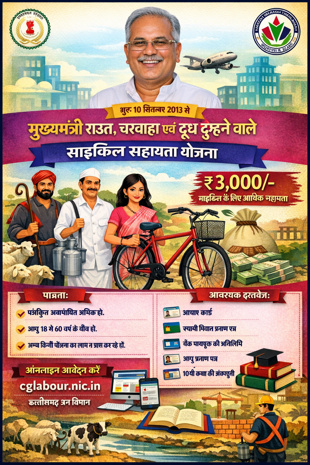 Labor Department of Chhattisgarh State started this scheme “Mukhyamantri Raut, Charavaaha Evan Doodh Duhane Vaale Bicycle Sahaayata Yojana” for unorganized worker on 10 September 2013. The main objective of the scheme to empower unorganized worker by providing financial assistance.
