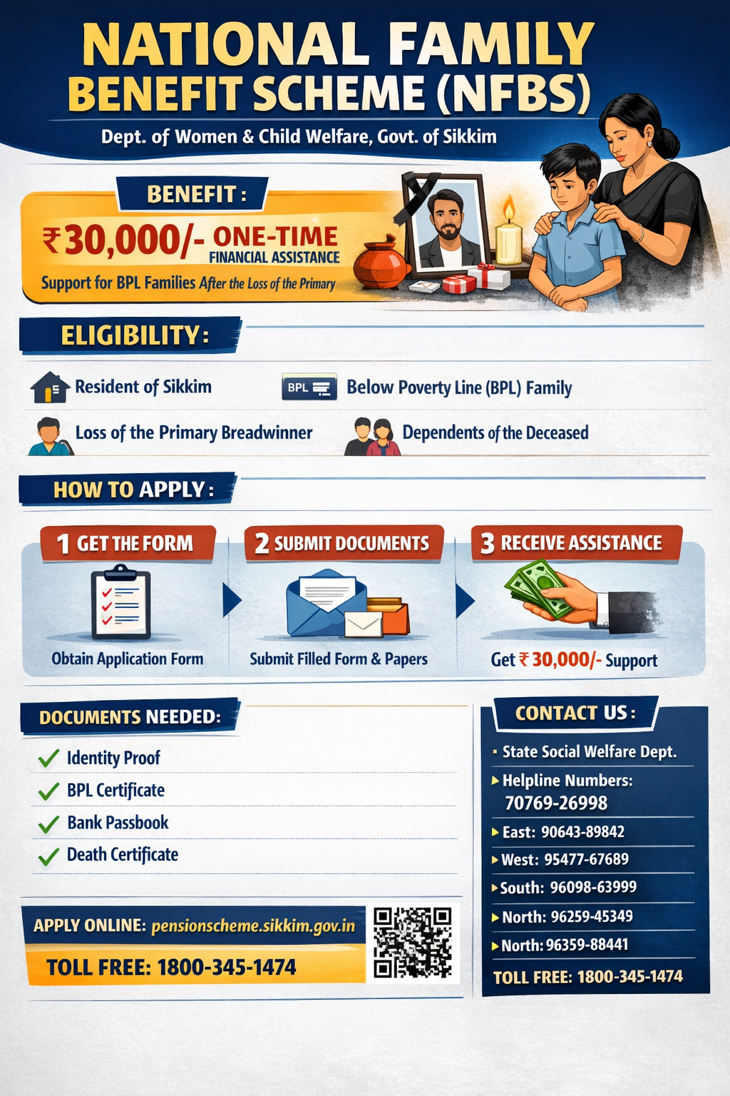 The scheme “National Family Benefit Scheme (NFBS)” was launched in 2016 by the Department of Women & Child Welfare, Govt. of Sikkim. Under this scheme, a lump sum amount of ₹ 30,000/- as financial assistance is provided to the bereaved household in the event of the death of the “Primary breadwinner” belonging to the Below Poverty Line (BPL) Category. The one-time grant amount consists of Central and State Government Share. (i.e. ₹ 20,000/- as Central Share and ₹ 10,000/- as State Share)