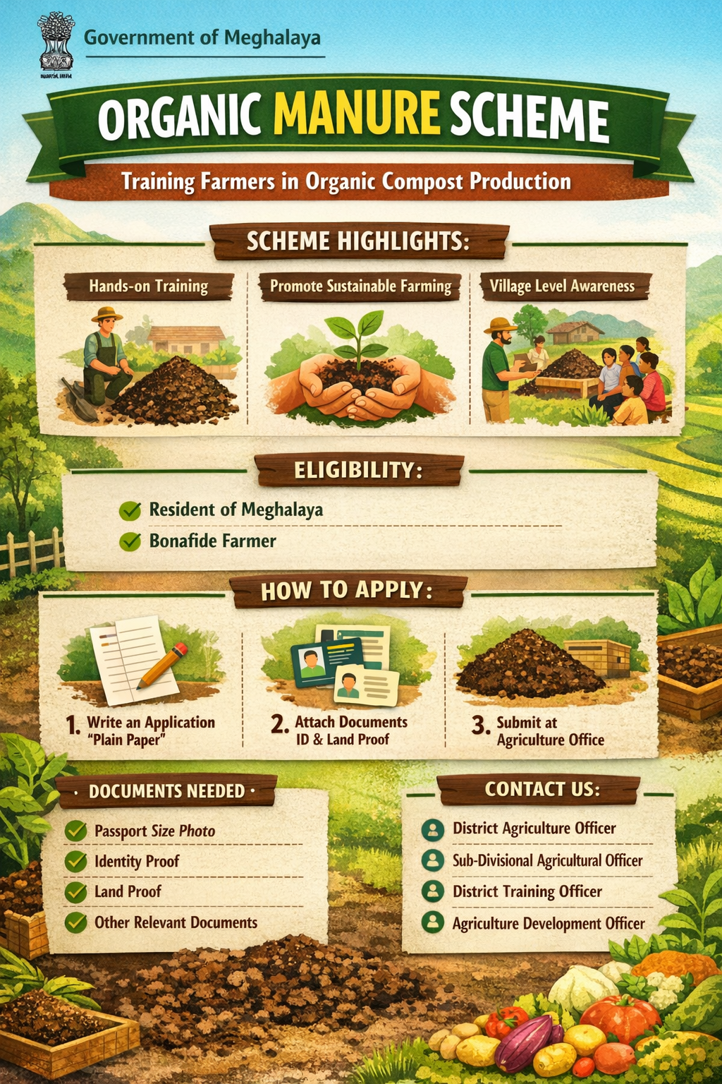The “Organic Manure Scheme” is a State Plan Scheme, which is implemented by the Department of Agriculture & Farmers’ Welfare, Government of Meghalaya. The objective of the scheme is to provide hands-on training at the village level on the production of organic compost inputs such as compost for plant health management for sustainable agriculture.