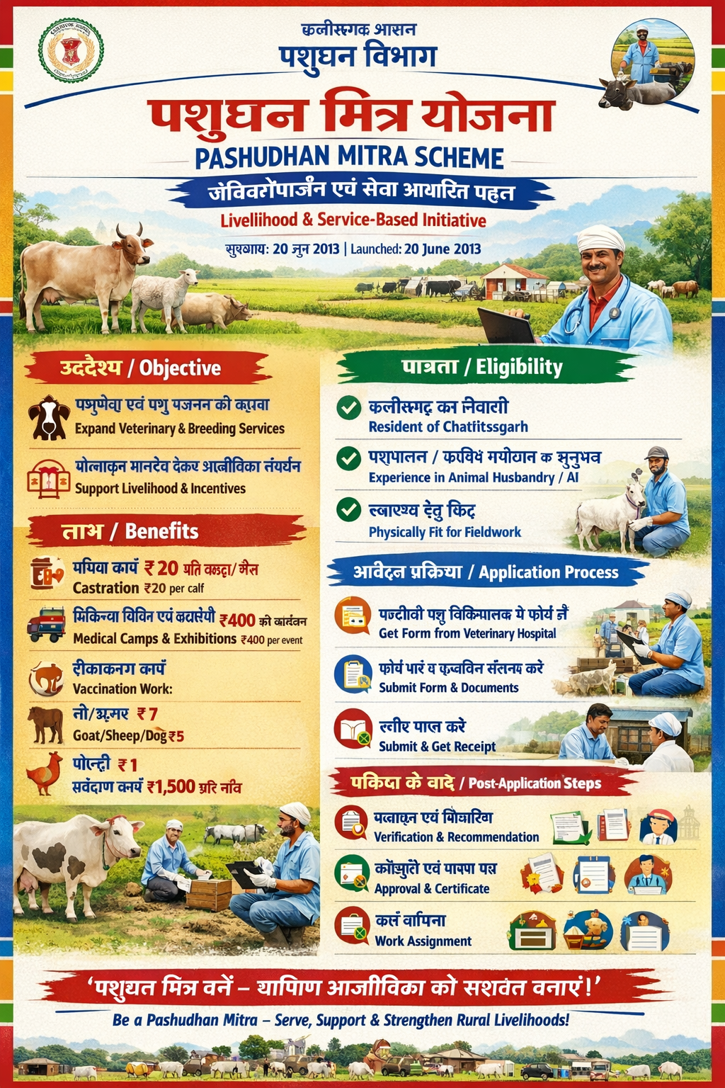 Launched on 20th June 2013, the scheme “Pashudhan Mitra Scheme” is a livelihood and service-based scheme by the Animal Husbandry Department, Government of Chhattisgarh. The scheme aims to expand veterinary and animal breeding facilities while ensuring efficient service delivery and a strengthened information system through Gausevaks and private artificial insemination workers. It also provides an incentive honorarium to Pashudhan Mitras (working cow-helpers and private artificial insemination workers) to support their livelihood and sustain their interest in the work.