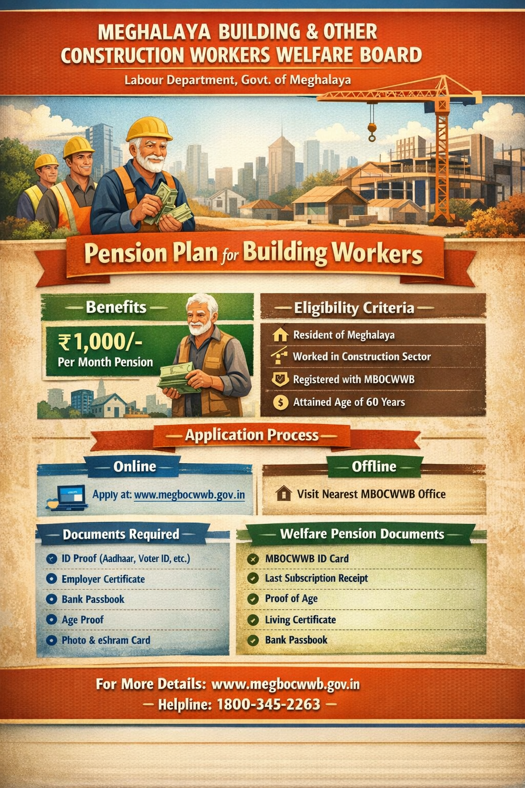 The scheme “Pension Plan” is a social security scheme, implemented by the Meghalaya Building and Other Construction Workers Welfare Board (MBOCWWB), Labour Department, Government of Meghalaya. Under the scheme, a member of the fund who has been working as a building worker for not less than one year after the commencement of these rules shall on completion of sixty years of age be eligible for a person. The Pension will become payable from the 60 years of the succeeding to the month in which he completed 60 years of age.