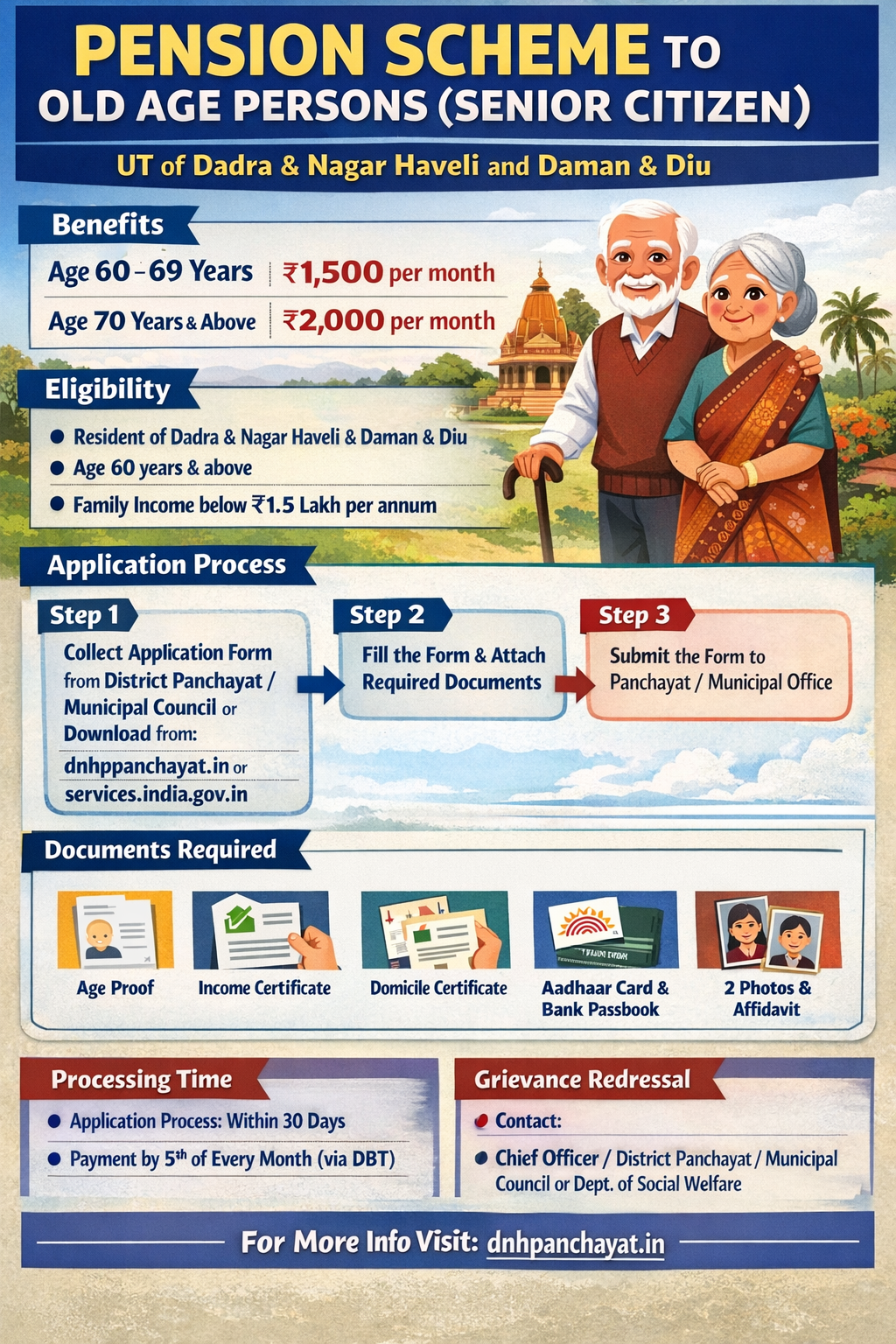 The scheme “Pension Scheme to Old Age Persons (Senior Citizen)” is implemented by the Social Welfare Department, UT of Dadra & Nagar Haveli and Daman & Diu. The scheme aims to support senior citizens in meeting their basic needs during old age. It is specifically targeted at residents of Dadra & Nagar Haveli and Daman & Diu who are 60 years and above, with an annual family income not exceeding ₹1.5 lakh per annum. Under this scheme, eligible individuals aged 60–69 years receive a monthly pension of ₹1,500/-, while those aged 70 years and above receive ₹2,000/- per month.