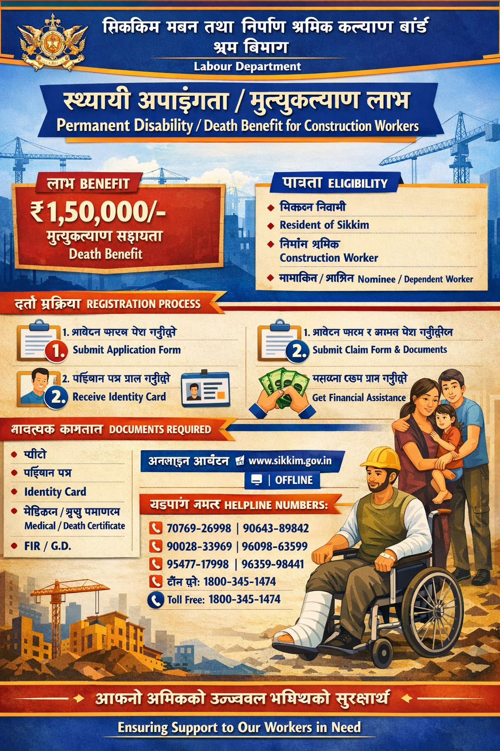 The “Permanent Disability/ Death Benefit for the Construction Workers” by the Sikkim Building and Other Construction Workers Welfare Board, Labour Department, is a welfare scheme for the registered workers of the board. Under this scheme, financial assistance is provided to the nominees/ dependents of a member, in case of his/her death or Permanent Disability.