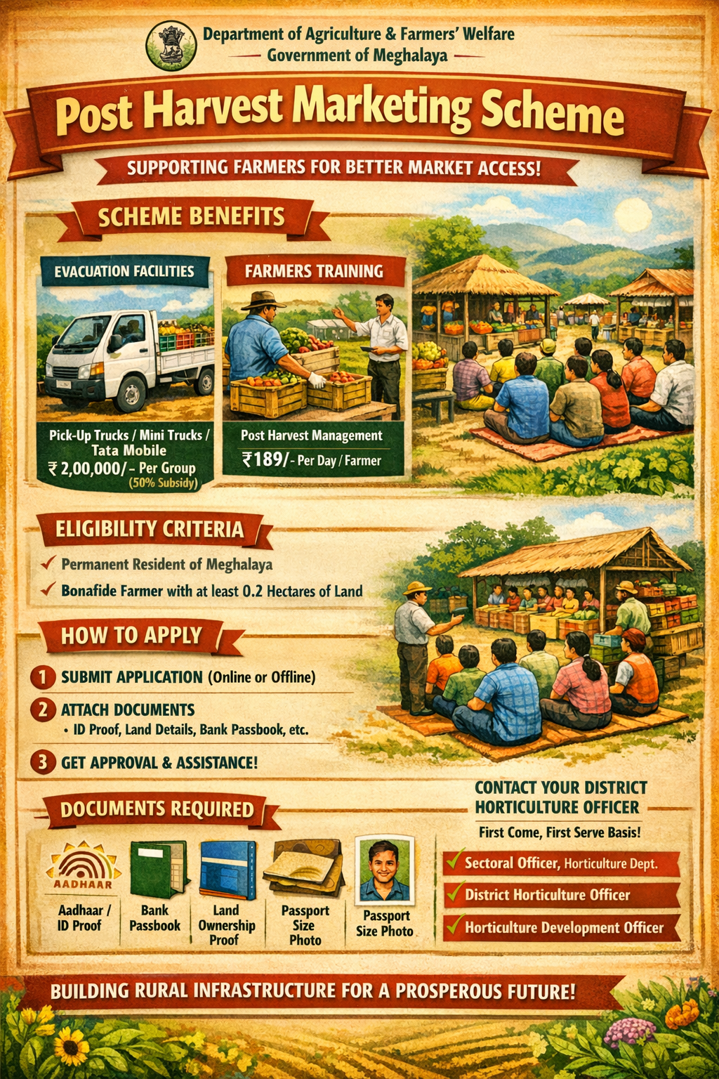 The “Post Harvest Marketing Scheme” was launched by the Department of Agriculture & Farmers’ Welfare, Government of Meghalaya for the creation of post harvest marketing infrastructure. Under the scheme, assistance is provided for evacuation facilities like pick-up trucks/ mini trucks/Tata mobile to the Farmers Groups/ Farmers Clubs/ SHG farmers Co-Operative Societies/ FIG/ FPOs, etc. for transportation of farm produce to the market.