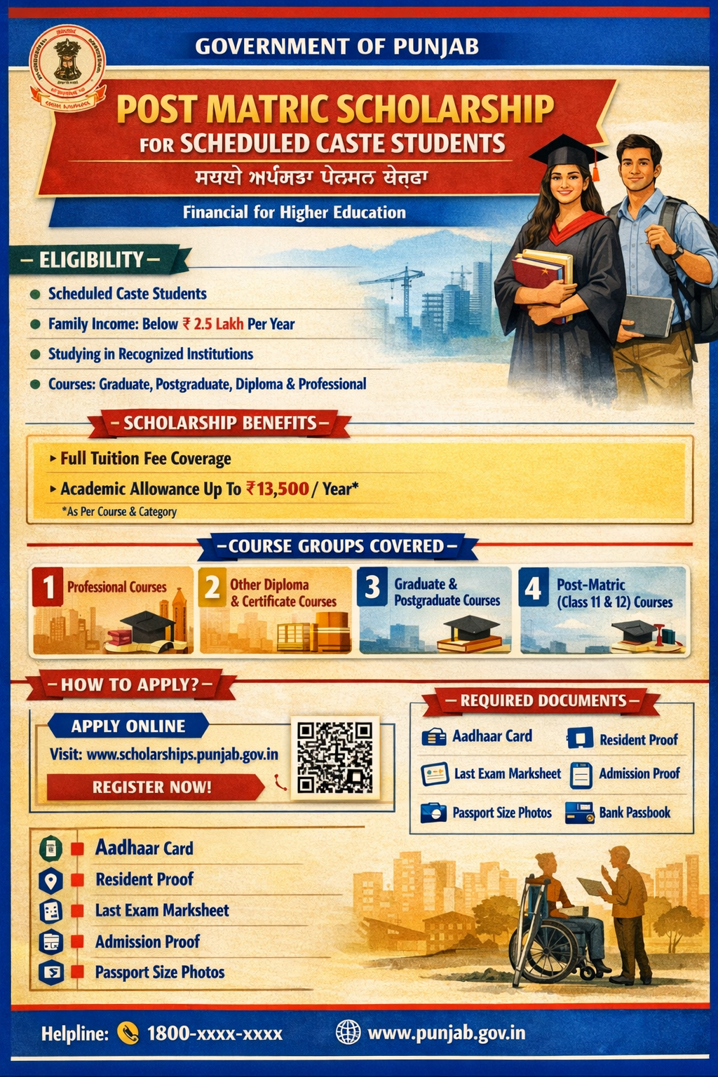 The objective of the scheme is to provide financial assistance to the Scheduled Caste students studying at post matriculation or post-secondary stage to enable them to complete their education. Scholarships will be paid to the students whose parents/guardians’ income from all sources does not exceed Rs. 2,50,000/- (Rupees two lakh, fifty thousand only) per annum.