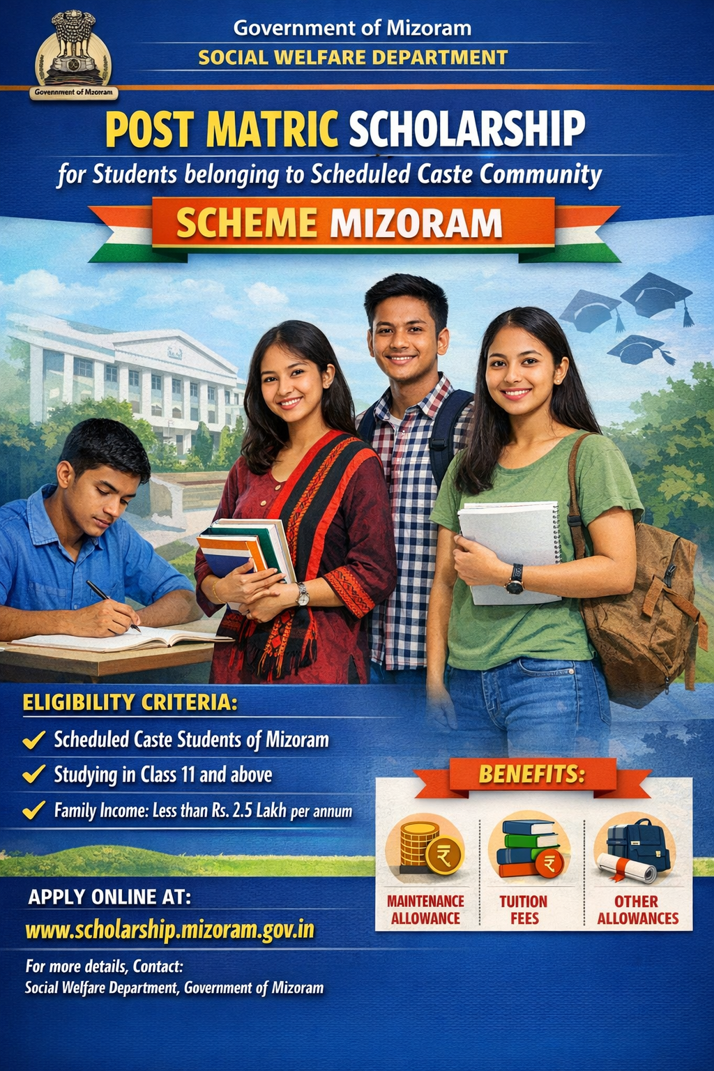 The scheme “Post Matric Scholarship for Students belonging to Scheduled Caste Community” was launched by the Mizoram Scholarship Board, Government of Mizoram. The objective of the scheme is to provide financial assistance to students belonging to Scheduled Castes pursuing post-matriculation recognized courses in recognized institutions. The scheme covers professional, technical as well as non-professional and non-technical courses at various levels and the scheme also includes correspondence courses including distance and continuing education.