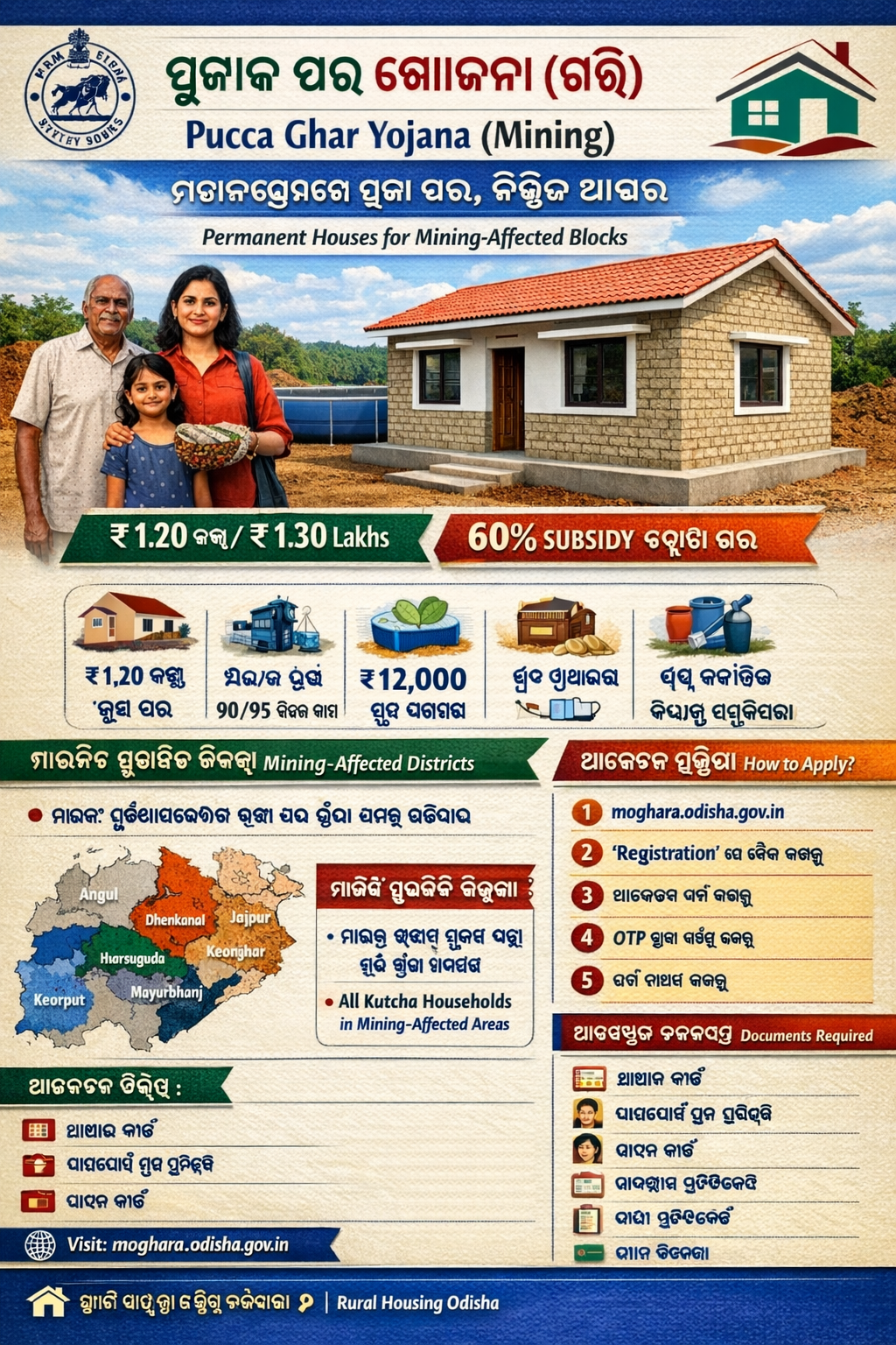 The government of Odisha is committed to providing “Pucca Houses” to all the eligible kutcha households in all the mining-affected blocks of nine mineral-bearing Districts: Angul, Dhenkanal, Jajpur, Jharsuguda, Keonjhar, Koraput, Mayurbhanj, Sundargarh & Rayagada. Assistance to construct Pucca houses will be sanctioned to eligible households in these areas under the “Pucca Ghar Yojana (Mining)” Scheme.