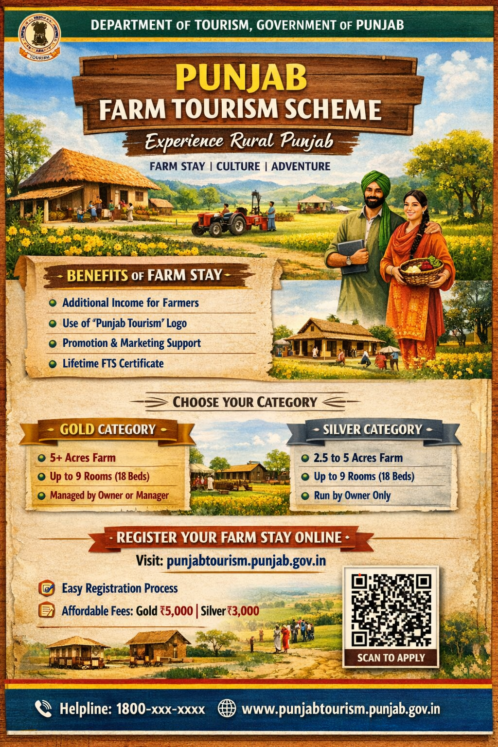 The scheme “Punjab Farm Tourism Scheme” was launched by the Department of Tourism & Cultural Affairs, Government of Punjab. The scheme envisages to provide to tourists with a clean, hygienic, and comfortable stay in the farmhouses spread across the State of Punjab. The scheme also aims to provide a cultural experience to domestic and foreign tourists through their exposure to village life. The concept will also help to provide additional sources of income to the farming community. Thus, it will be a complete package of farm tourism, adventure tourism, rural and village tourism and cultural tourism to visiting tourists in the predominantly agricultural State of Punjab. It has therefore been decided to register the farm stay units by the Department of Tourism (DoT)/Punjab Heritage Tourism Promotion Board (PHTPB) and lay down suitable guidelines for the same.