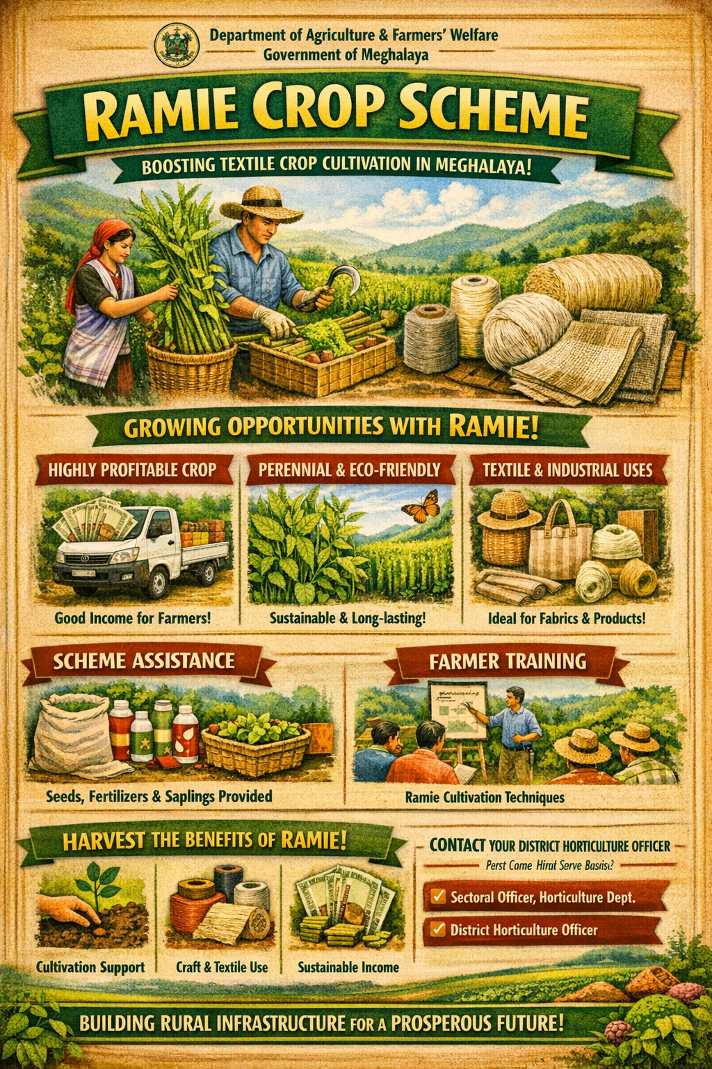 The “Ramie Crop Scheme” is a State Plan Scheme, which is implemented by the Department of Agriculture & Farmers’ Welfare, Government of Meghalaya. The objective of the scheme is to encourage the cultivation of perennial and remunerative textile crops such as Ramie in suitable areas by providing necessary inputs and training.