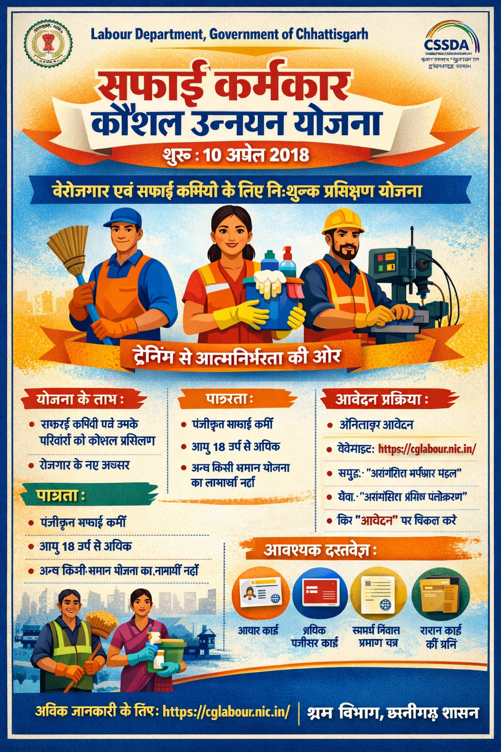 Labor Department of Chhattisgarh State started this scheme “Safai Karmakaar Kaushal Unnayan Yojana” for unorganized worker on 10 April 2018. The main objective of the scheme to empower unorganized worker by training to to unorganized workers and sanitation workers and their families for the trades identified by the Technical Education Department (CSSDA) of the State Government from time to time.
