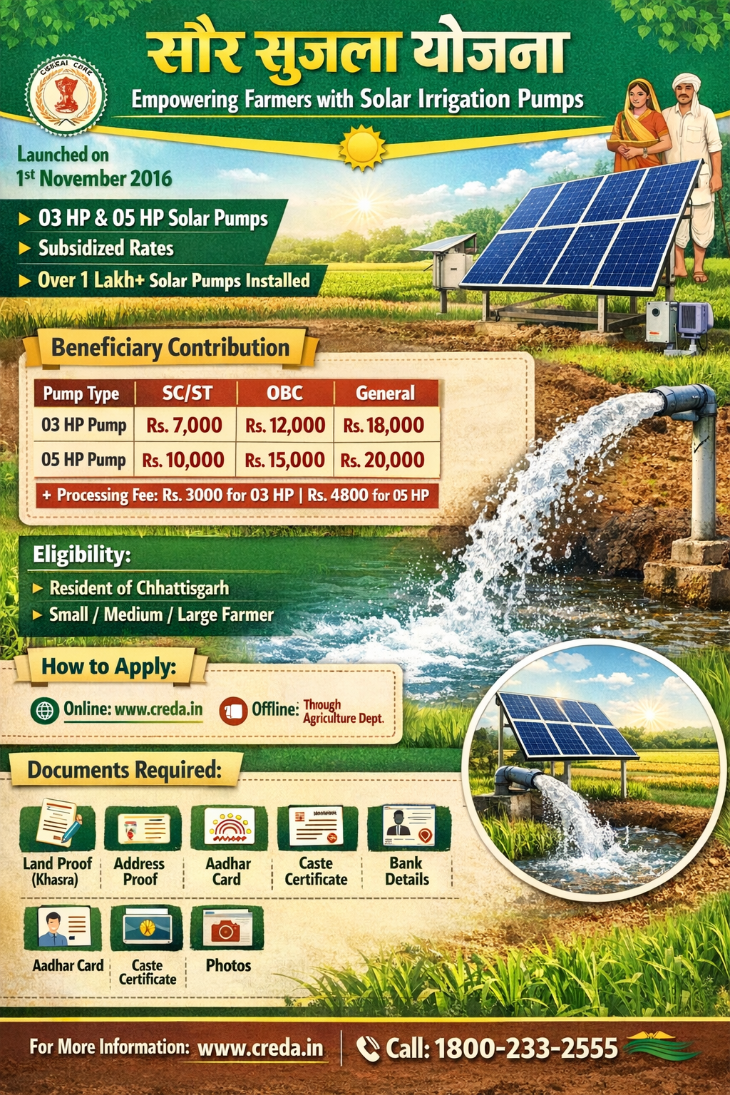 Saur Sujala Yojana is being implemented by Chhattisgarh State Renewable Energy Development Agency (CREDA- Chhattisgarh State Renewable Energy Development Agency). Beneficiaries under the scheme are selected by the Agriculture Department. Under the scheme, more than 01 lakh solar pumps have been installed.