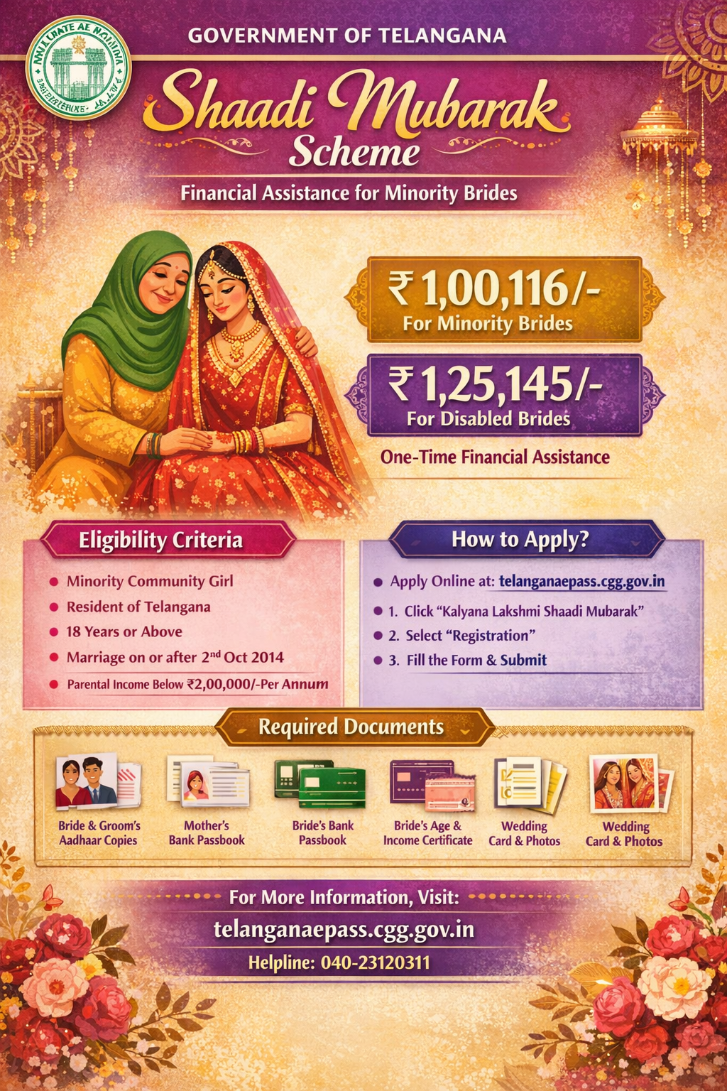 In order to prevent child marriages and support the marriage expense of financially distressed families, on 02nd October 2014, Government of Telangana introduced a welfare scheme called “Shaadi Mubarak’’, providing financial assistance for marriages of minority community girls.