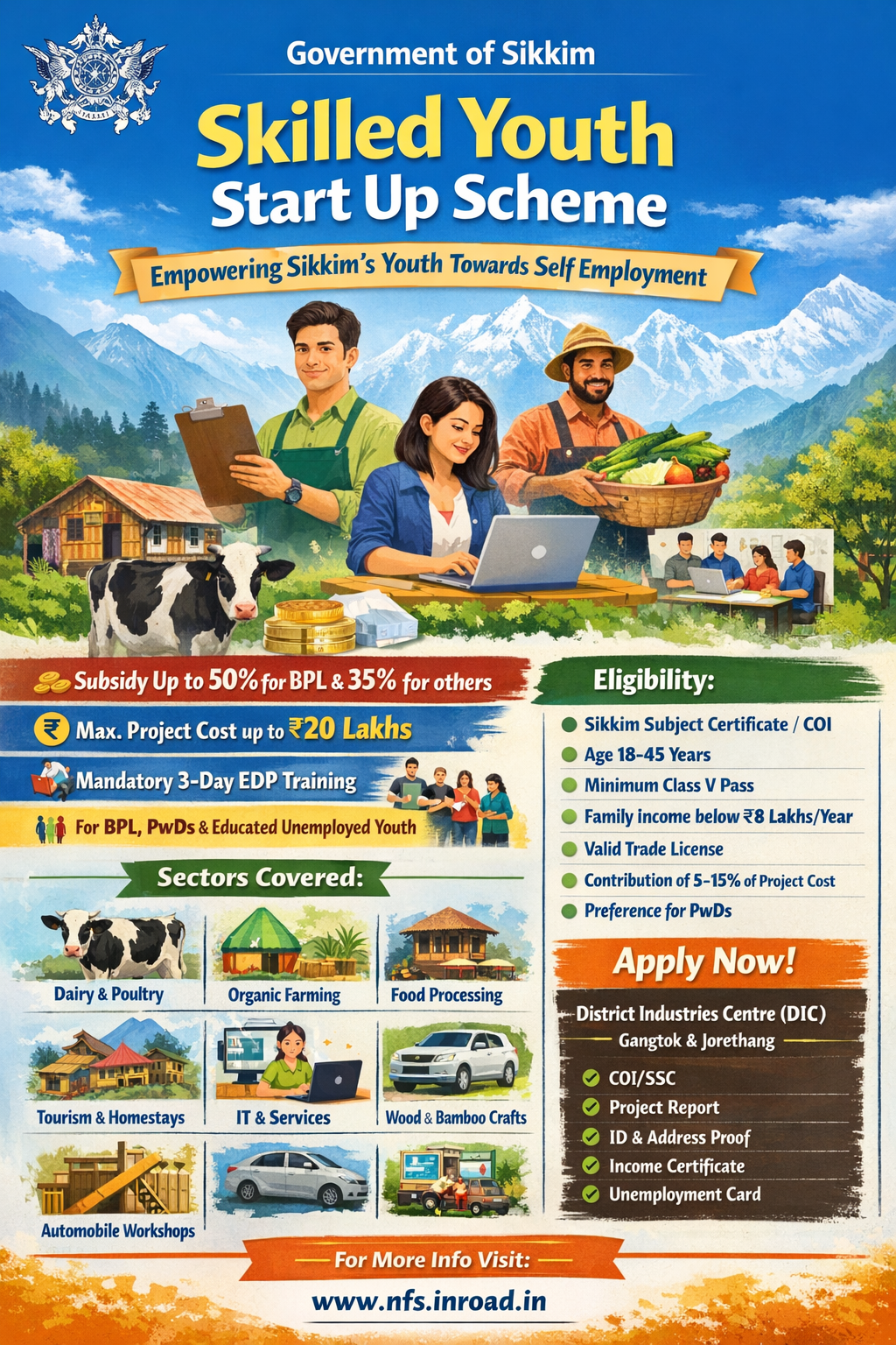 The issue of employment creation has been a matter of great concern since long in Sikkim. The Government of Sikkim having pro-people attitude and the vision to reduce unemployment and create adequate self employment opportunities in the long run has formulated the Skilled Youth Start Up Scheme. The Scheme is intended to generate equitable entrepreneurial opportunities in rural as well as urban areas of the State, particularly among the educated unemployed youth to become self employed by setting up Manufacturing/Service/Business/Cooperative/Agriculture & allied activities by availing loan (category wise) with back ended subsidy assistance from the State Government @ 50% for BPL and @ 35% for rest on financially viable/ bankable Projects cost.