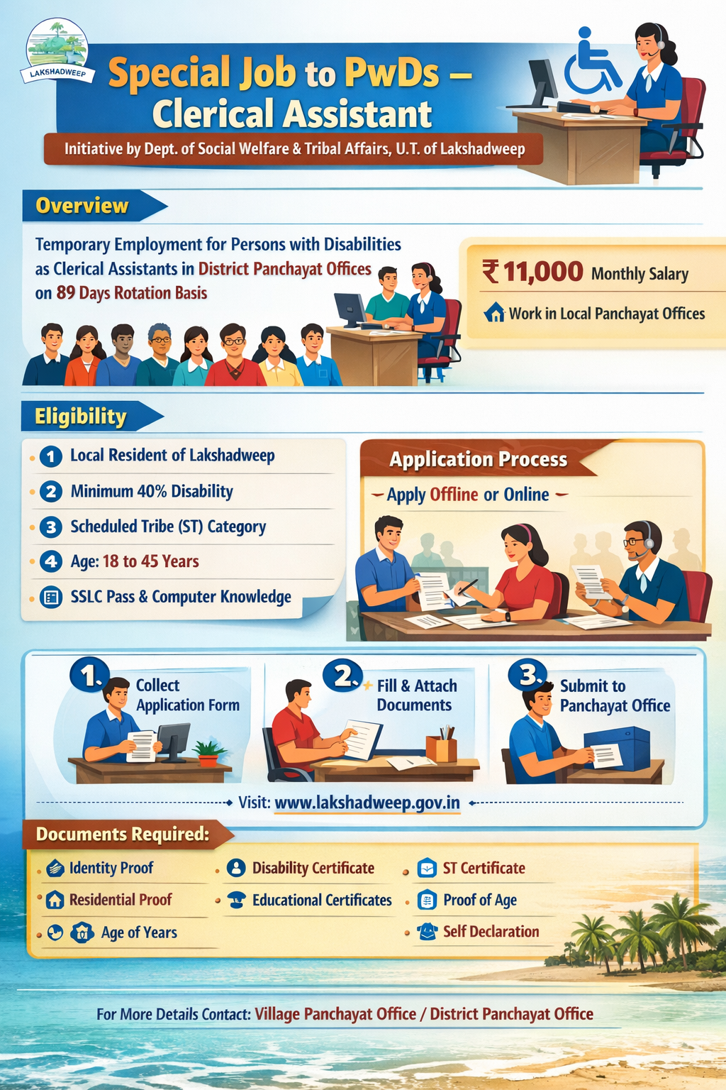 The scheme “Special Job to PwDs – Clerical Assistant” was introduced by the Department of Social Welfare & Tribal Affairs, Union Territory of Lakshadweep, with the aim of providing temporary employment opportunities to Persons with Disabilities (PwDs) having a minimum of 40% disability in the UT. Under this scheme, 11 PwD candidates are employed as Clerical Assistants on an 89-day rotation basis in the District Panchayat offices of their respective islands to address issues related to disabled persons and other associated matters.