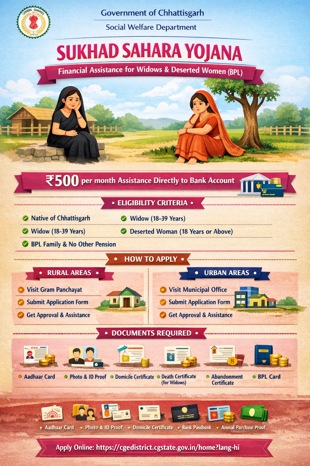 The “Sukhad Sahara Yojana” was launched by the Social Welfare Department, Government of Chhattisgarh. Under this scheme, financial assistance are provided to the widows and deserted women who are living below poverty line (BPL) to support them in living a respectful life.