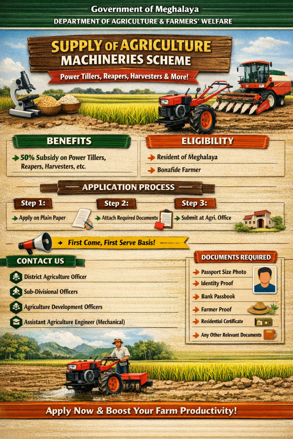 The “Supply of Agriculture Machineries Scheme” was launched by the Department of Agriculture & Farmers’ Welfare, Government of Meghalaya for the distribution and sale of Agriculture Machineries such as Power Tillers, etc. to farmers at a subsidized rate.