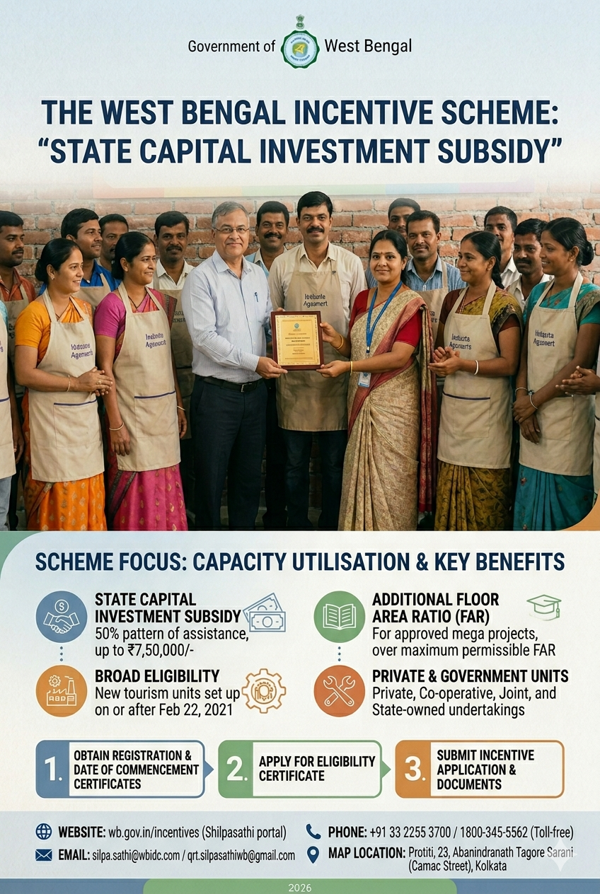 The scheme “State Capital Investment Subsidy” is a sub scheme under “The West Bengal Incentive Scheme”. It was launched on 22nd February, 2021, by the Department of Tourism, Government of West Bengal, and shall remain valid upto 31st December, 2025.