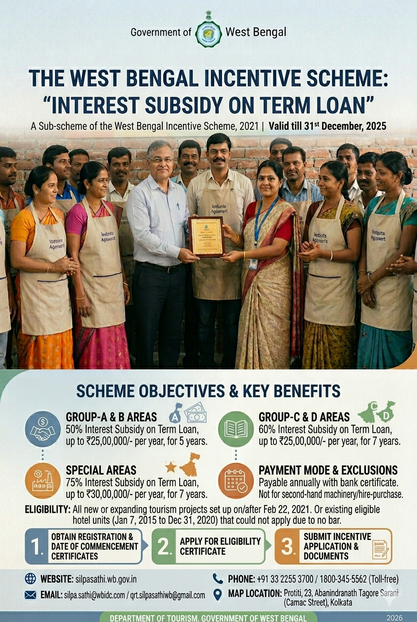 “Interest Subsidy on Term Loan” is a sub scheme under “The West Bengal Incentive Scheme”. It was launched on 22nd February, 2021, by the Department of Tourism, Government of West Bengal, and shall remain valid upto 31st December, 2025.