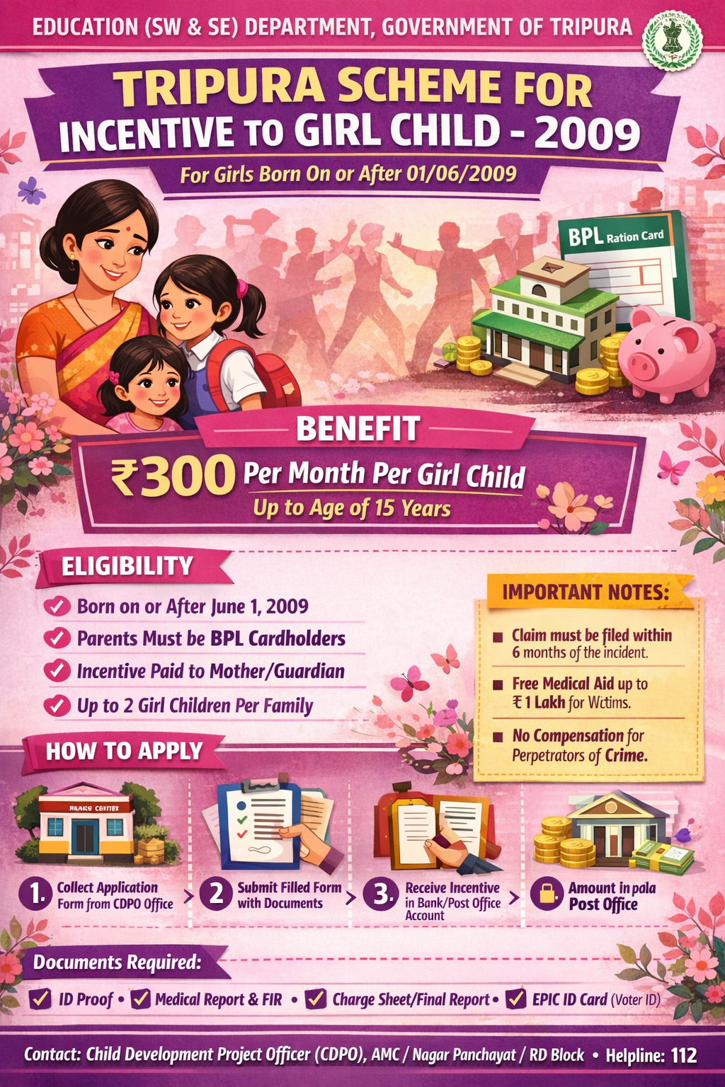 The scheme “The Tripura Scheme for Incentive to Girl Child-2009” by the Education (SW & SE) Department, Government of Tripura, aims to provide an incentive to girl children born on or after 01/06/2009 to the parents who are cardholders of listed BPL households. The incentive will be provided per head per month up to the month the girl child attains the age of 15 years. The incentive amount will be paid to the mother of the girl child, preferably to the bank/post office account. Up to two girl children in a family will be covered by the scheme. The scheme is implemented by the Child Development Project Officer (CDPO) of the concerned AMC/Nagar Panchayat/RD Block.