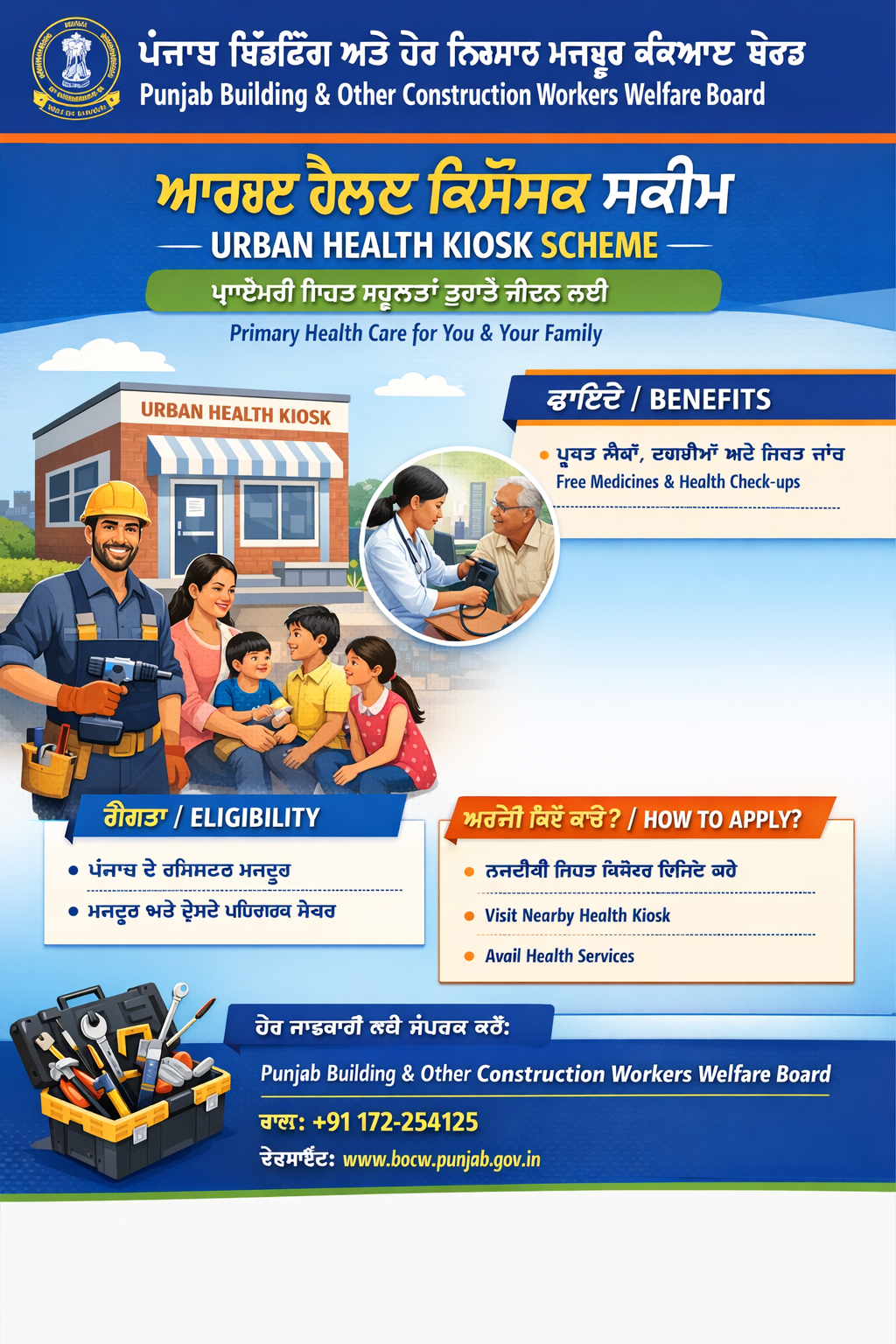 The “Urban Health Kiosk Scheme” by the BOCW Welfare Board, Department of Labour, Punjab, is a welfare scheme for the registered workers of the board. Under this Scheme, primary health facilities are provided to the construction workers & their families in urban health kiosks run by Punjab Health Society in slum areas.