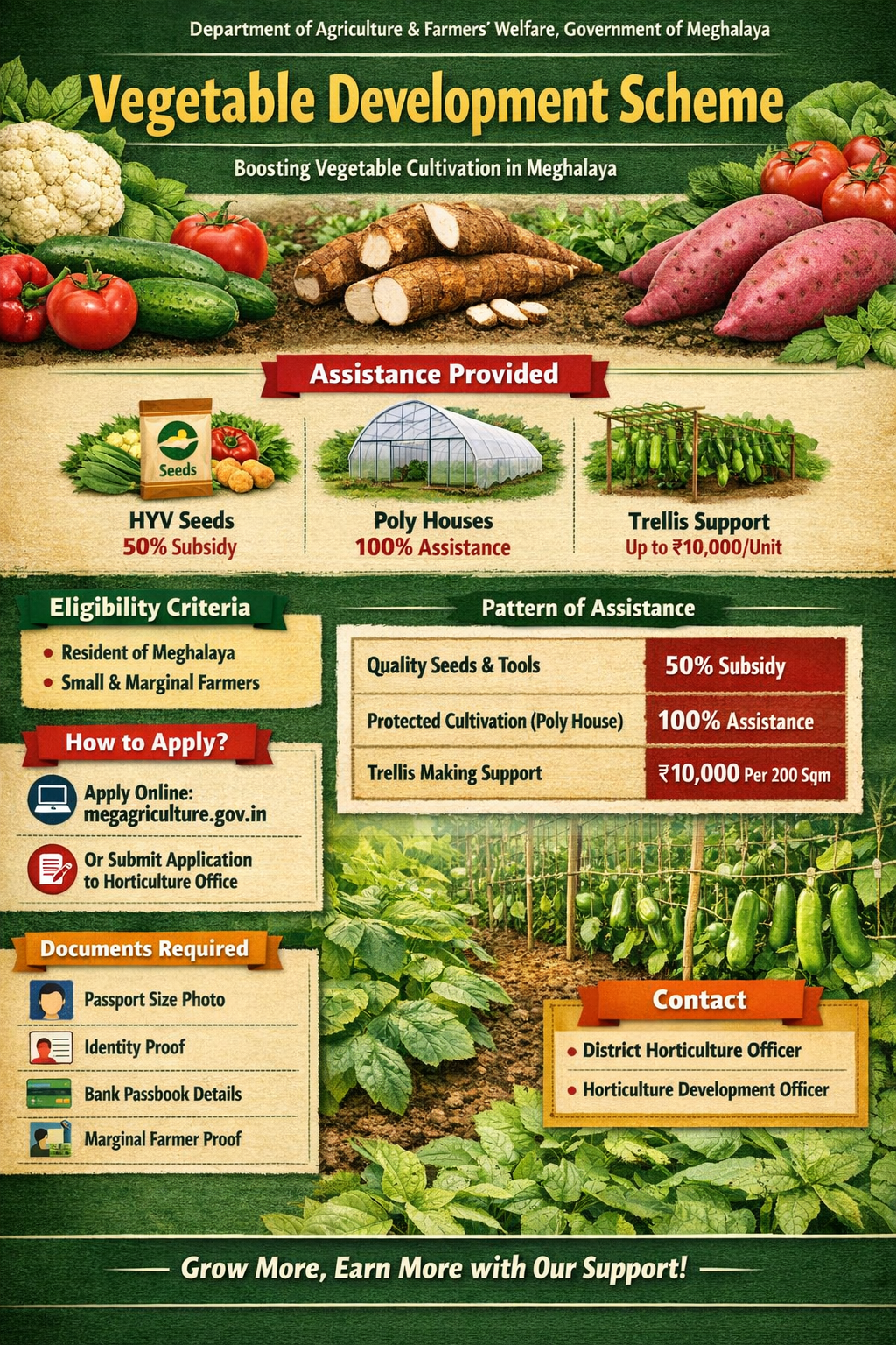The scheme “Vegetable Development Scheme” was launched by the Department of Agriculture & Farmers’ Welfare, Government of Meghalaya to promote vegetable production through HYV seeds/Hybrids/Improved/Open Pollinated seedlings, including assistance to farmers.