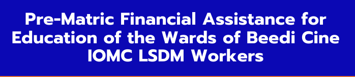 A scholarship scheme by the Directorate of Social Welfare, Ministry of Labour and Employment wherein financial assistance for education is provided to the Wards of Beedi/Iron Ore Mines, Manganese Ore & Chrome Ore Mines (IOMC)/Limestone Mines, Dolomite Mines (LSDM)/Mica Mines and Cine Workers, varying from ₹1,000/- to ₹25,000/- per student per annum. The benefits under the scheme are being transferred through the DBT system and the applications under this scheme are invited and processed through the National Scholarship Portal. The Applicant must have passed the last qualifying examination on the first attempt. However, Students promoted to the next class are also eligible to apply for the above scholarships. Candidates for the award of scholarships should have taken regular admission for studies at recognized institutions in India in any course of general or technical education, including medical, engineering, and agricultural studies.