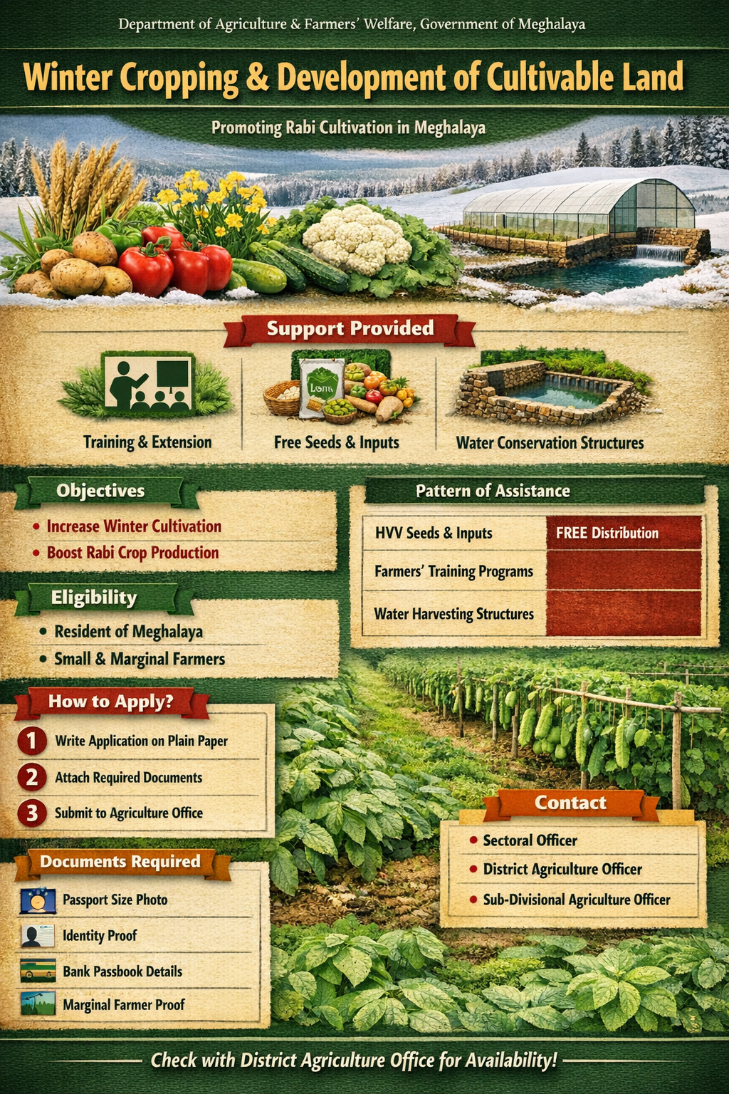 The scheme “Winter Cropping & Development of Cultivable Land” was launched by the Department of Agriculture & Farmers’ Welfare, Government of Meghalaya. The objectives of the scheme are as follows: